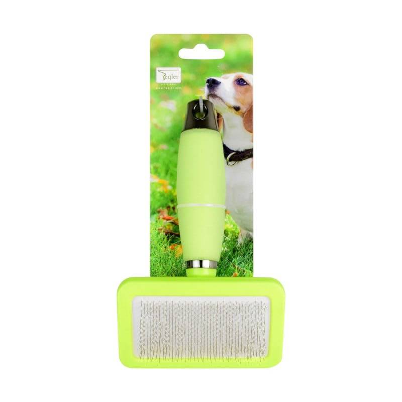 he particularly wide Teqler fur brush with silicone handle can be used for the gentle removal of dirt and loose or matted hair thanks to its fine bristles. The silicone coated handle allows for a perfect grip and is equipped with an eyelet to hang it up.